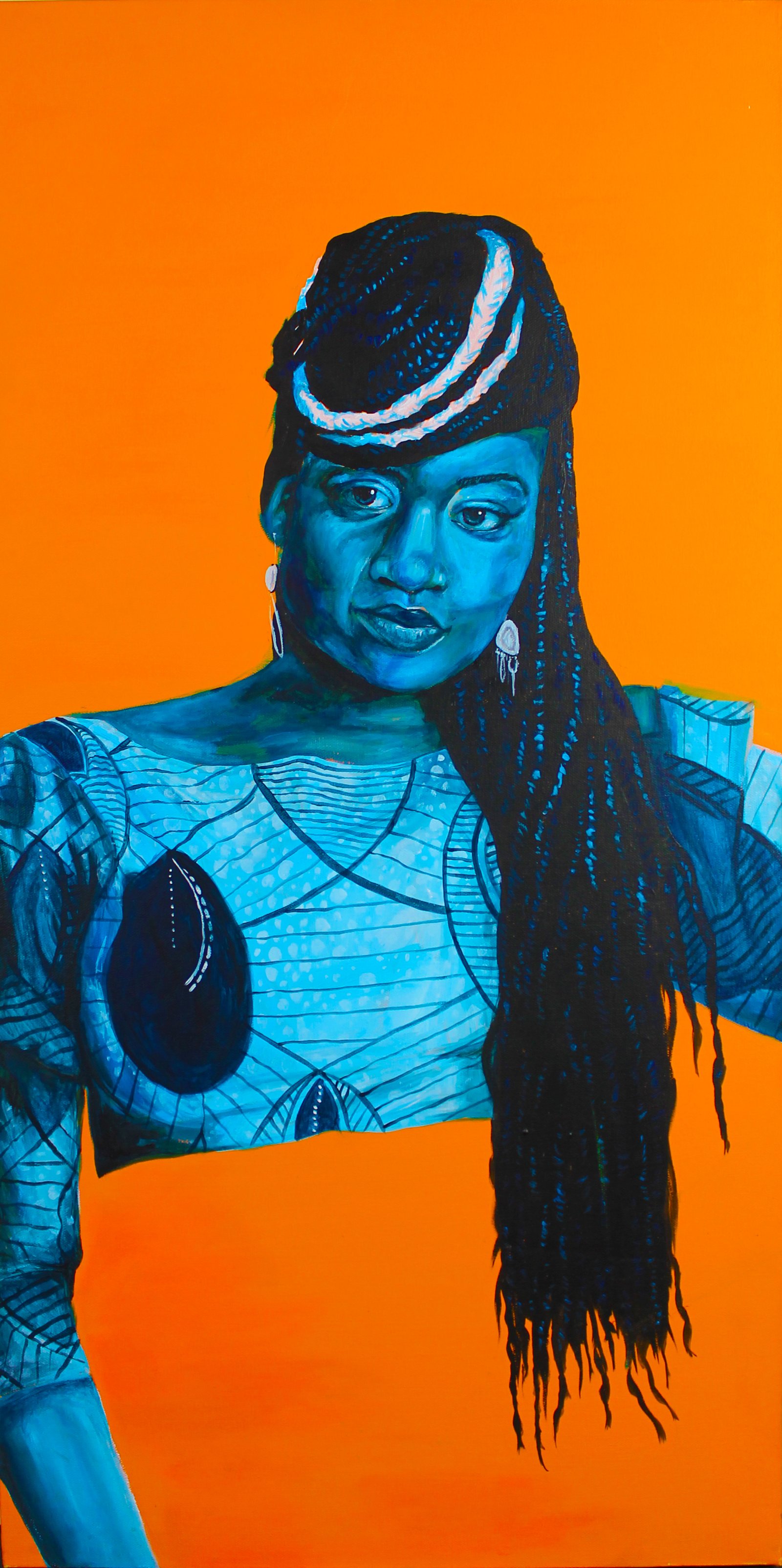 Appreciating a painting becomes an aesthetic value, rather than contemplating the originality of its content. The illusion of realism and the vibrancy of geometrical shapes becomes a spectacle. The sitters are stripped away of their skin colour; identification is no longer of importance and in its place are people of various colours, on depthless backgrounds, there are no signs, symbols or clues left. What we see is a flatness of graphic nature with these posed faces. I further strip the paintings by taking out sections of the sitter’s limbs or clothing to create interesting imagery. There is no hidden agenda and one should not try and decipher them.